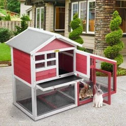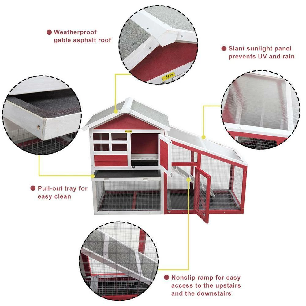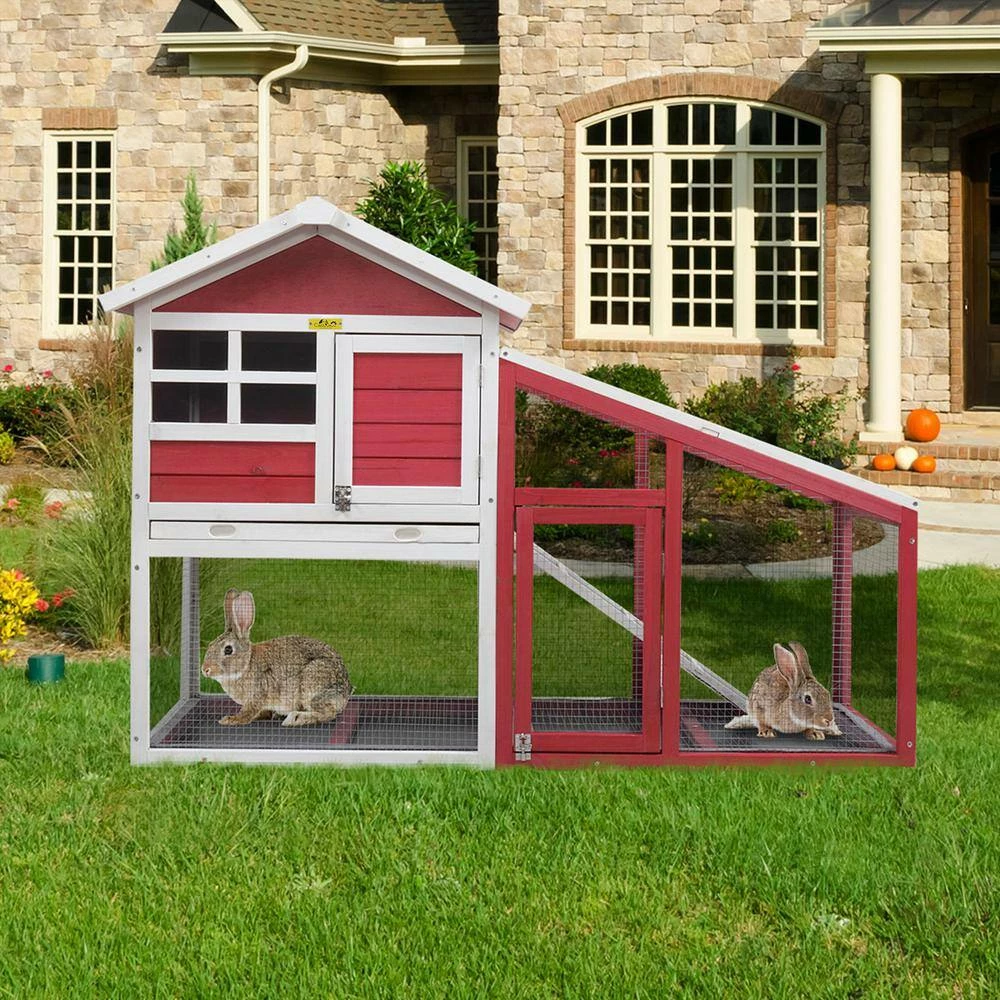 An outdoor house for your pets is always necessary and this is our 2-story rabbit house. Designed in an elegant apartment style, this hutch has a large activity area surrounded by galvanized wires mesh (including the floor) and a cozy resting room constructed by natural wood and covered by asphalt felt, allowing your pets to safely and freely roam or play, away from over radiation due to the half-transparent sunlight panel. And the lockable doors are convenient for putting in or taking out your pets. If you are looking for a spacious and aesthetic house for your bunny, this 1 could be a good choice.
