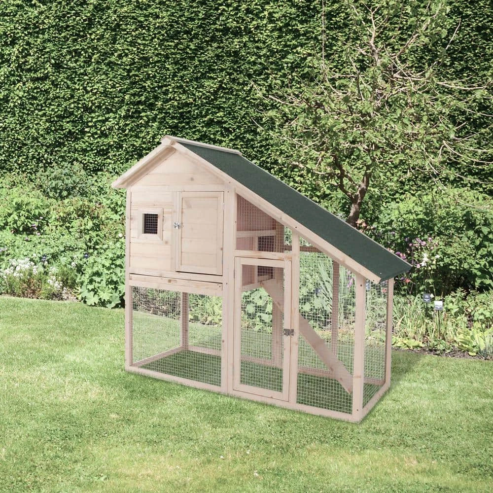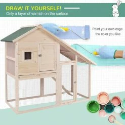 This 2-tier outdoor rabbit cage from PawHut includes a natural wood appearance that is both stable and perfect for the DIY in you and your child. The top cabinet includes an enclosed area with a latched door that can be easily opened, as well as a closed panel that hides a ramp that gives access to the bottom level. The floor level is surrounded by open fencing, making your pet safe and sound in the structure. With multiple doors and a slide out tray for easy access to the inside space for cleaning, feeding, and other routine tasks. Made of durable fir wood and a composite asphalt roof, this rabbit playpen hutch will keep your furry friends dry and safe for years to come.