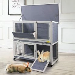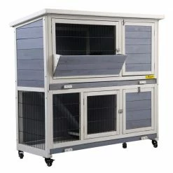 Rabbit is always a popular pet in our life. And feeding rabbits can effectively relieve the stress and depress from the work as well as cultivate children more love and kindness, this is a double-tier rabbit house with a spacious inner in which a ramp stair leads to the second floor, with 4 doors with metal latches and a flip-up asphalt roof, this rabbit hutch could give handy access of keeping in or taking out your pets and pave a layer of cotton cloth in the rest box. Plastic coated steel wire mesh is applied in large scale to ensure good ventilation and sufficient sunlight as well as reliable protection against predators. Entirely crafted with natural solid fir wood through water-based lacquer soaked process, the cage keeps good resistance to moisture or mildew based on the sturdy, healthy and comfy properties. Meanwhile On the door of the upper compartment a large feeding slot is fixed to store hay and grain, partitioned by a steel mesh that is used to control the flow of food. Besides, 4 casters are configured on the bottom of the whole hutch while 2 of them are lock-able, contributing to effortless moving and stop. People no matter adults or children incline to be addicted to bunnies’ loveliness and it’s time to get your little pet friends a comfy and safe home.