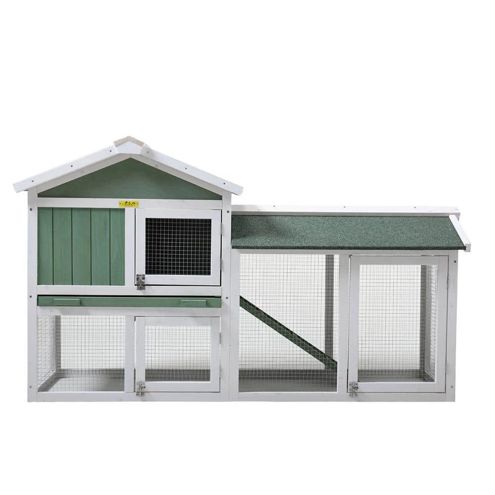 Give your small furry friends an ideal mix of freedom and security with this 58 in. L wood outdoor rabbit hutch. This rustic 2-story pet house comes with an elevated main house and a spacious run that are connected by a stable beamed ramp, allowing your lovely bunnies, chickens, rats and other small pets to roam inside and outside, upstairs and downstairs, in the Sun or in the shade for the finest comfort. The sturdy waterproof fir wood construction with 2 protective asphalt roofs ensures the pet home durable with little maintenance. Surrounded by heavy-duty galvanized wire mesh, the modern hutch keep the inside animals safe while offering fresh air. The elevated enclosed main house with a mesh door and a pull-out tray gives a clean, warm and comfortable private place to rest and sleep. Moreover, 3 lockable doors allow the pets to access easier. Don’t hesitate to buy such a versatile wood house to make your small companions and yourself happy.
