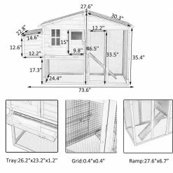 - Overall dimensions: 73.6×27.6×46.5 inches. Suggested capacity: 4-5 chickens