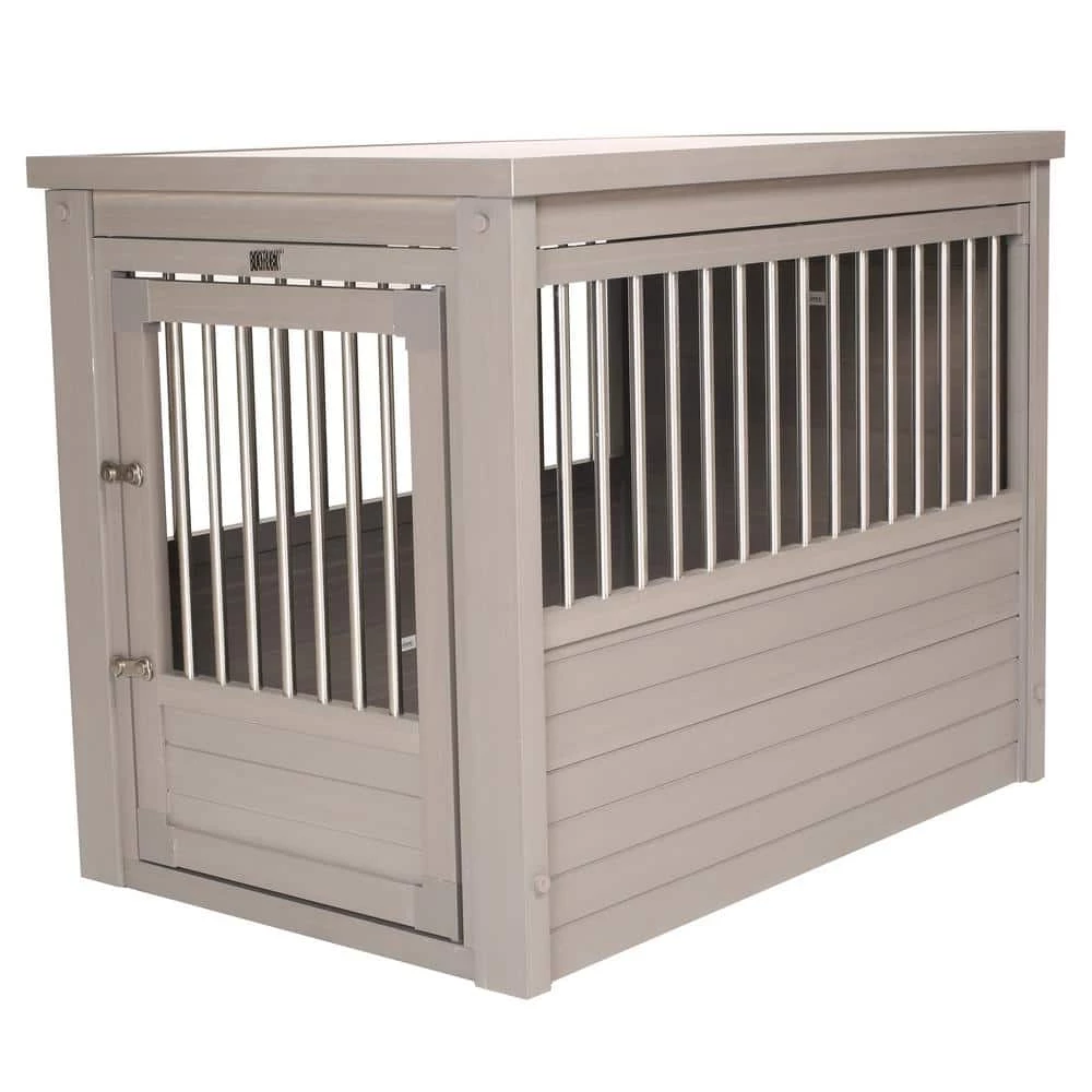 This ECOFLEX Dog Crate End Table is the perfect place for your pet when they are indoors. This ECOFLEX Crate End Table can easily do double duty in many houses where it can serve as an end table in the family room, bedroom or living room. Made of ECOFLEX material. ECOFLEX is a proprietary formula that incorporates reclaimed wood and plastic into the material that allows the product to be eco-friendly and a great value as it will outlast most other products. Designed for this use and carries an unprecedented one (1) year manufacturer warranty. Can be painted to coordinate with your other furnishings and inspire your pet style. Removable table top for easy cleaning. Color will never fade. Front door latches securely and cannot be accidentally opened. Small and Medium crates have one secure latch. Large and Extra Large crates have two secure latches. Crates are made for dogs that are familiar with crates and are less likely to chew. Spindles made of stainless steel tubing. Please note that any crate that isn’t 100% wire or metal has the ability to be chewed. This ECOFLEX Dog Crate melds form and function into a crate that can double as a piece of your home decor. Available in four sizes. Small for dogs up to 20 lbs. Medium for dogs up to 50 lbs. Large for dogs up to 80 lbs. X-Large for dogs up to 100 lbs. This product may not be a good fit for dogs that suffer from anxiety.
