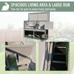 Give your furry friend a comfortable living space from PawHut. This deluxe wooden quail hutch is a perfect mix of safety and freedom for your furry friends and offers all the comforts of home. A cozy, house-style indoor space and spacious front courtyard area downstairs offers plenty of room to run around the rabbit cage The upper area is designed for privacy and rest while the lower area offers more space for run and play. An internal ramp provides quick access between the 2. Lockable multi-door provides easy access for cleaning, feeding and other routine tasks.