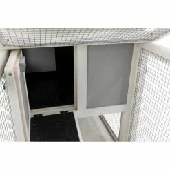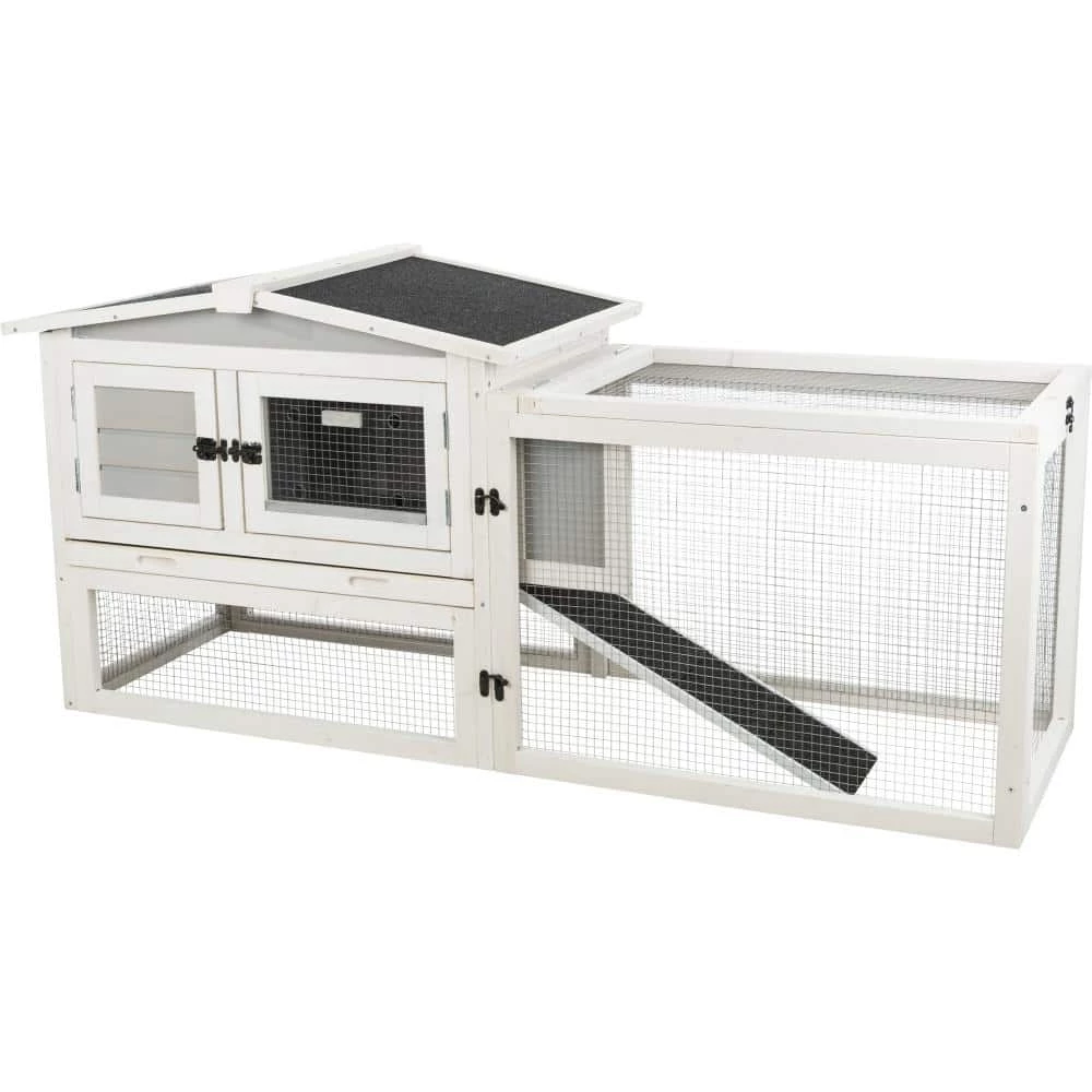 TRIXIE’s Insulated Rabbit Hutch with Outdoor Run XS is ideal for single and smaller breed rabbits, as well as guinea pigs. Outer walls, roof and tub include foam insulation, plus windows include removeable plastic panes. The 2-Story design has a retreat area on the upper level. It has both a hatch and sliding door to give owners the option to restrict access as needed. The non-slip ramp allows your pets to roam inside and outside, upstairs and downstairs, in the sun or in the shade for ideal comfort. The run opens from above and is easily attached/removed using metal hooks. The hinged roof with locking arm opens on one side. For easy maintenance, we’ve included a pull-out metal tray and a hinged roof with locking arm that can be opened on one side. Solid wood construction, painted finish and our finest materials mean this hutch will endure years of use with very little maintenance. Quick and easy assembly. 1-year warranty. Color: Gray. Dimensions (Inch): 61 in. x 21 in. x 28 in., hutch 30 in. x 21 in. x 28 in., run 31 in. x 21 in. x 23 in., mesh door 13 in. x 9 in., wood door 10 in. x 9 in., run opening 27 in. x 19 in., mesh gauge 0.12 in. x 0.07 in., mesh spacing 0.5. Mesh coating: powder-coated metal lattice. Weight: 42 lbs. Note: Water bottle and bowl not included.