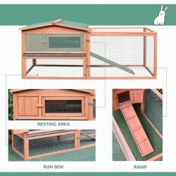 This 62 in. outdoor rabbit cage from PawHut is ideal for use with rabbits, guinea pigs, and other similar sized animals. This deluxe wooden rabbit hutch is a perfect mix of security and freedom for your furry friends and offers all the comforts of home. The upper area is designed for privacy and rest while the lower area offers more space for run and play. An internal ramp provides quick access between the 2.