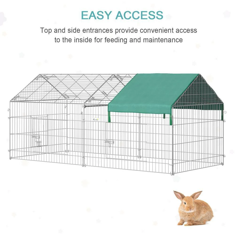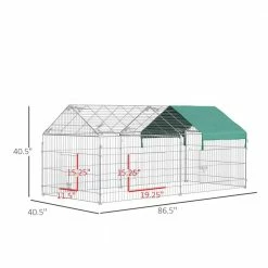 From PawHut, this enclosed pet kennel provides shelter and convenience. There are multiple points of entry to make sure that you can reach critters with ease. Whether you own rabbits, chickens, or cats, the metal kennel can be utilized as a spacious animal run. The animal enclosure can also be separated into slats for easy storage. Includes a cover, 4 ground stakes, and an instruction manual.