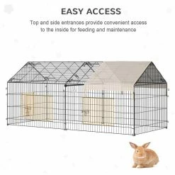 From PawHut, this enclosed pet kennel provides shelter and convenience. There are multiple points of entry to make sure that you can reach critters with ease. Whether you own rabbits, chickens, or cats, the metal kennel can be utilized as a spacious animal run. The animal enclosure can also be separated into slats for easy storage. Includes a cover, 4 ground stakes, and an instruction manual.