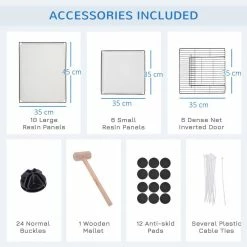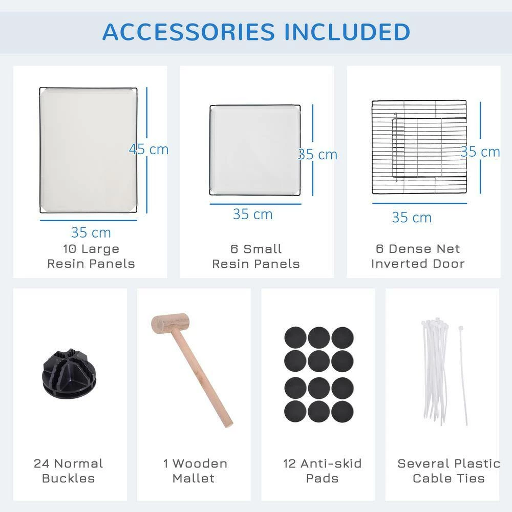 - Comes with 10 large resin panels, six small resin panels, and six dense net inverted doors;