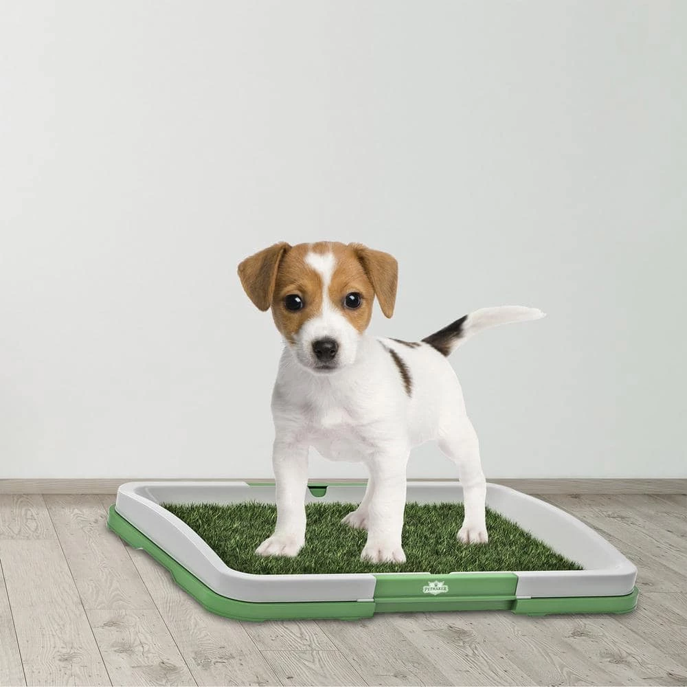 This mat and tray system gives dogs a place to relieve themselves when they can’t go outside. The ingenious mat is made of an antimicrobial and odor resistant artificial turf that gives off an organic scent, attracting dogs so they can be taught quickly that it is an acceptable spot for relief. The mat sits on top of a plastic insert which allows liquid to drain into the included locking tray for easy clean up.
