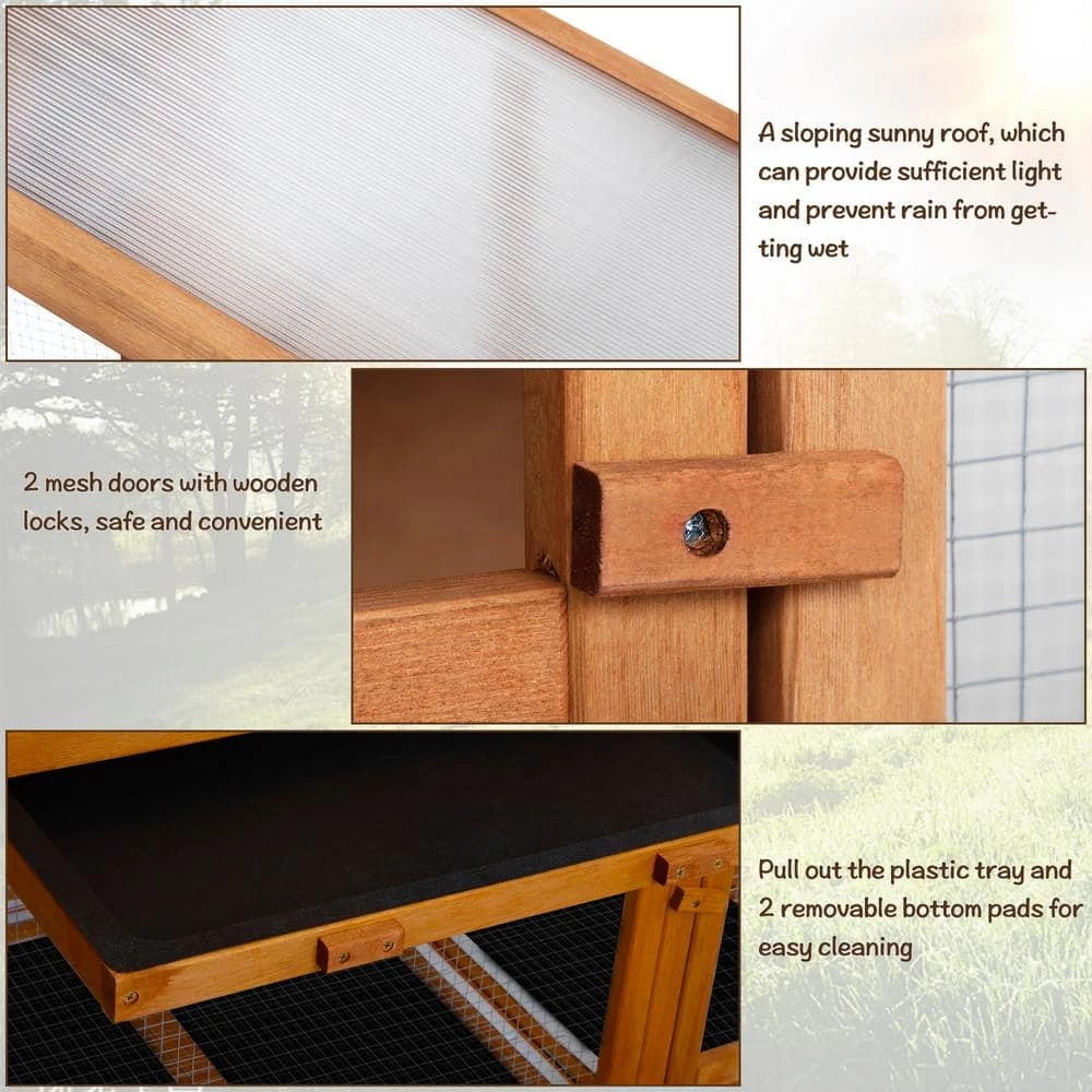 - Easy to clean and enter: featuring 2 removable bottom PVC layers, a leak-proof plastic tray, and 2 openable mesh doors, the chicken coop allows you to easily clean and refresh the interior, open the doors to take out your pets for happy interaction