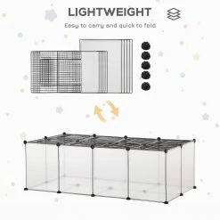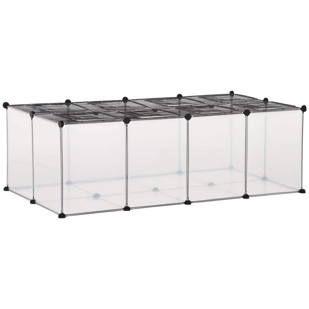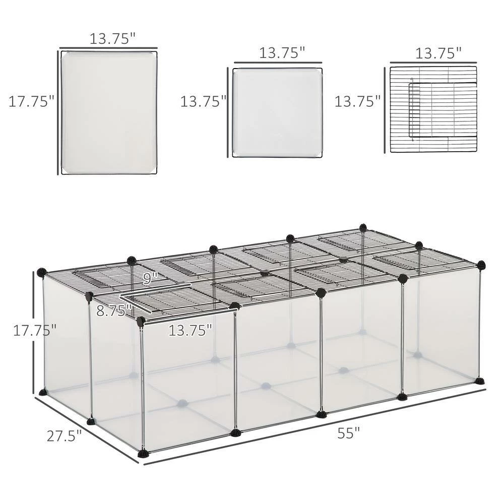- Comes with 12 large clear panels, 8 small clear panels, 8 wire doors, 32 standard connectors, 13 non-slip pads, several plastic cable ties, and a wooden mallet to help you assemble the cage;